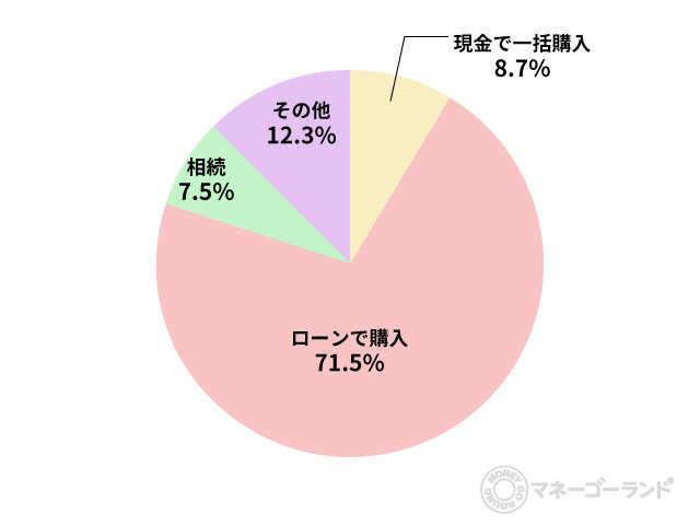 まず住宅購入の方法については、71.5%がローンを利用しており、現金で一括購入は8.7%、相続は7.5%でした。さらに購入時の年齢については、「25〜29歳」が最も多く23.3%となり、20代で購入した人は全体の47.4%、30代で購入した人は38.0%となりました。