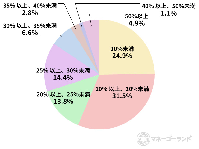 さらに世帯月収に対するローン返済額の割合については、「10〜20%」が31.5%と最も多い結果に。賃貸の家賃はひと月あたりの収入に対して、2割以内に収めるのが妥当と言われており、ローン返済においても同様のようです。