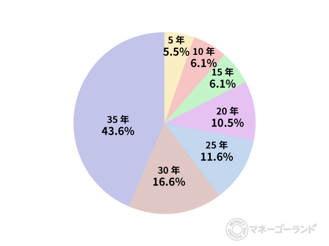ローン返済期間については、35年が43.6%と最も多く、30年は16.6%となり、6割の方が30年または35年でローンを組んでいることがわかりました。