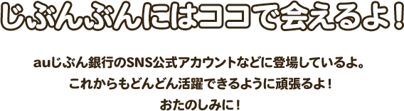 じぶんぶんにはココで会えるよ! auじぶん銀行のSNS公式アカウントなどに登場しているよ。これからもどんどん活躍できるように頑張るよ!おたのしみに!