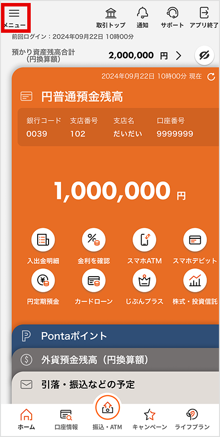 じぶん銀行アプリにログインし、画面左上の「メニュー」を選択